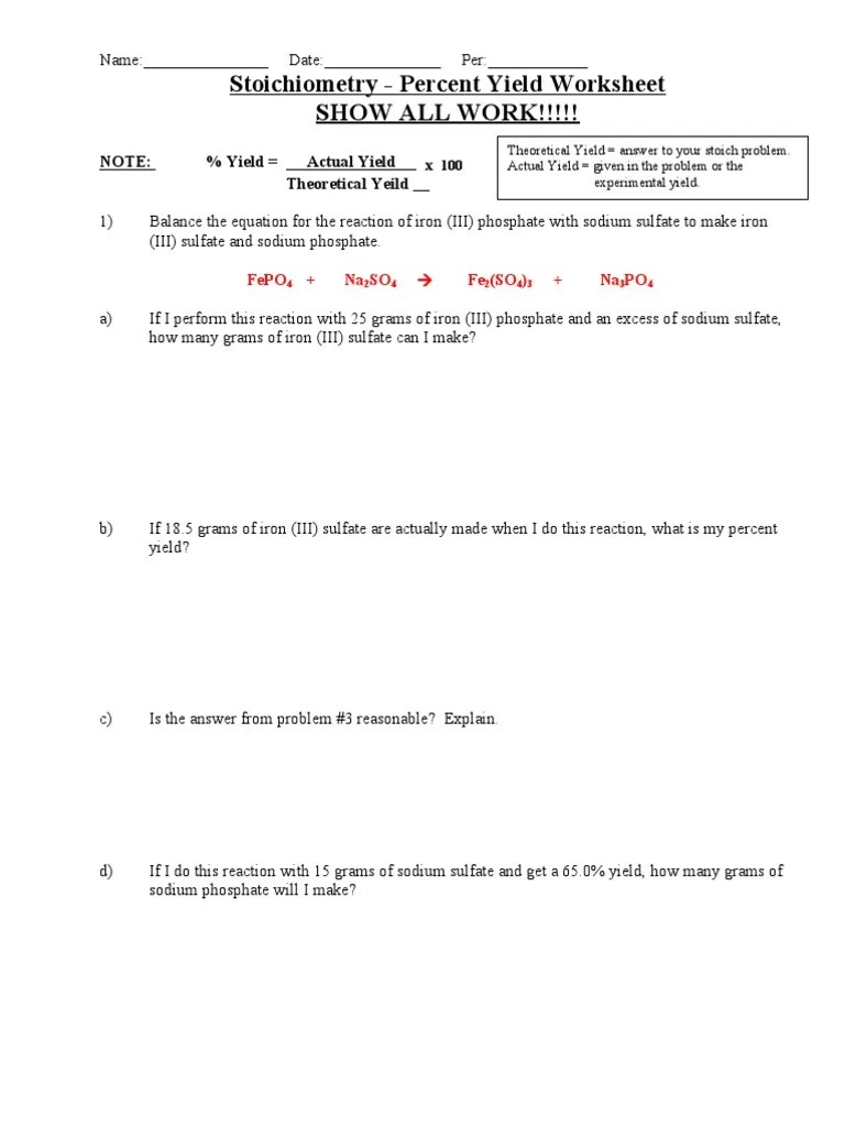 Actual yield = given in the problem or the. 7.4nh percent yield (for additional information see page 317 in the book). Percent yield for each of the problems below: Complete each statement below by choosing. Write a balanced equation for the reaction of tin (iv) phosphate with sodium carbonate to make tin (iv) carbonate and sodium phosphate. To answer this, we need . According to the following reaction:. Percent yield name date pd stoichiometry worksheet 2: Theoretical yield = answer to your stoich problem. W goes through 2 stoichiometry problems and finds the percent yield. Click on the link below to access the worksheet. Theoretical yield = the maximum amount of product that can be formed from given reactants. Use 400 g of h2 in stoichiometry equation to calculate the theoretical yield.